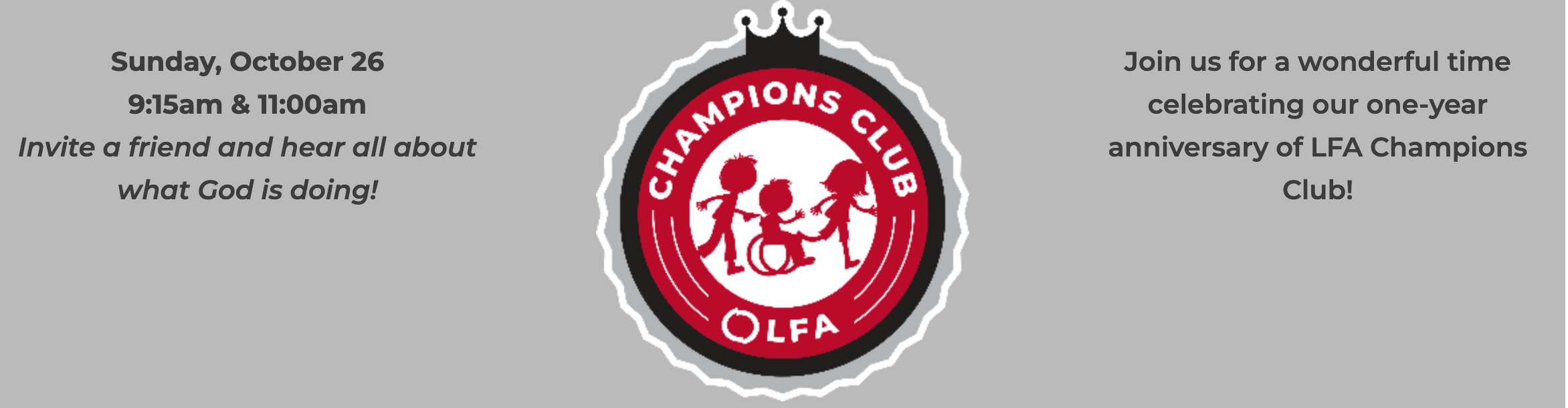 LFA Champions Club launched fall of 2023, specializing in ministry to kids with special needs ages four through twelve. Our partnership with Champions Club includes a unique space to carry out this remarkable ministry at LFA. Each child will receives care and attention from trained buddies from our Champions Club serve team.